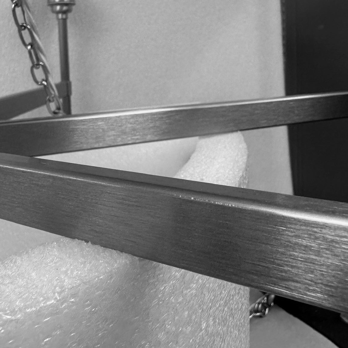 A pair of imperfect chandeliers with small marks to the frame and slight inconsistencies in finish. Please refer to additional images for details.
