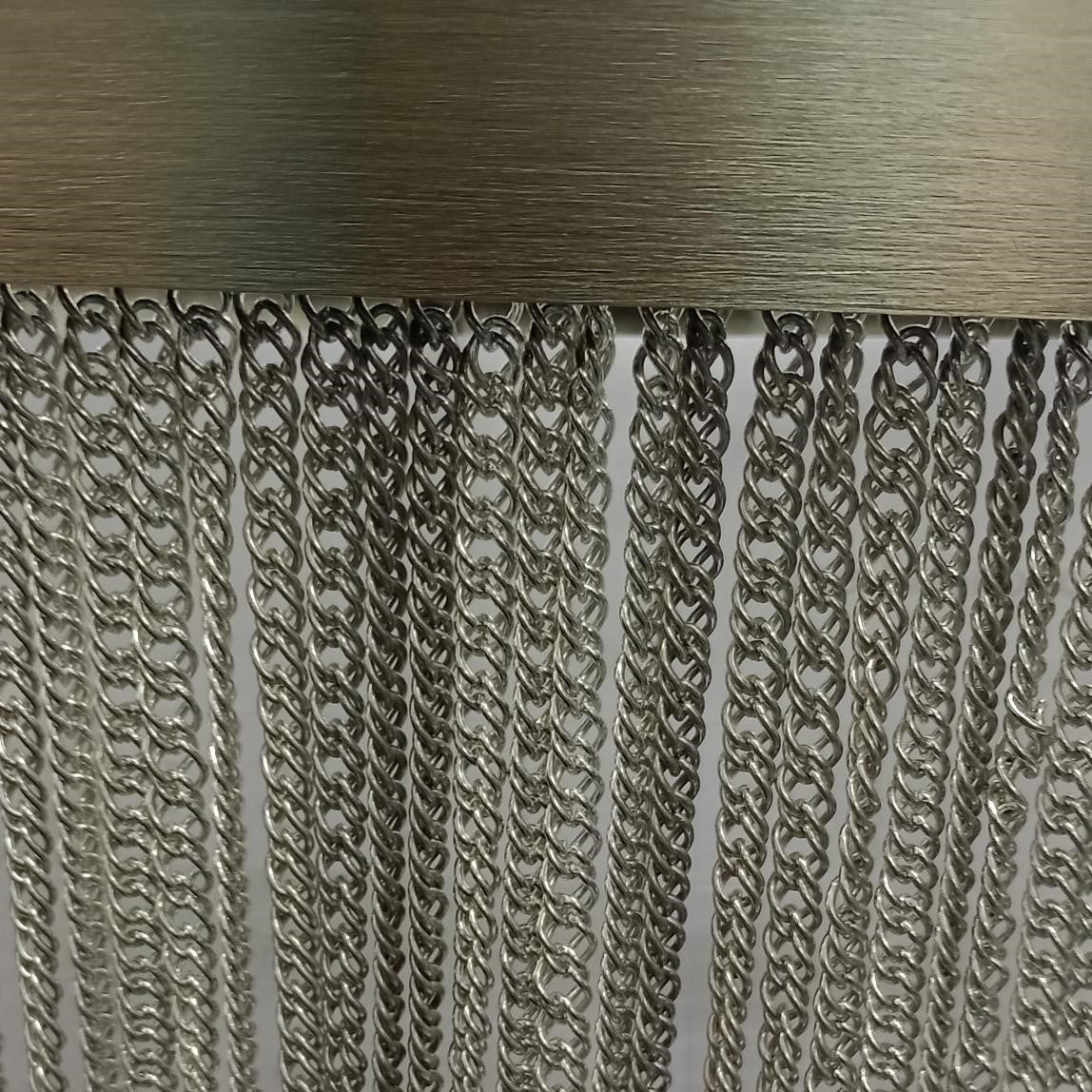 Three shallow tiers of delicate chain strands and hand-crafted metalwork. Provided with 1m length suspension chains which can be shortened on site during installation.